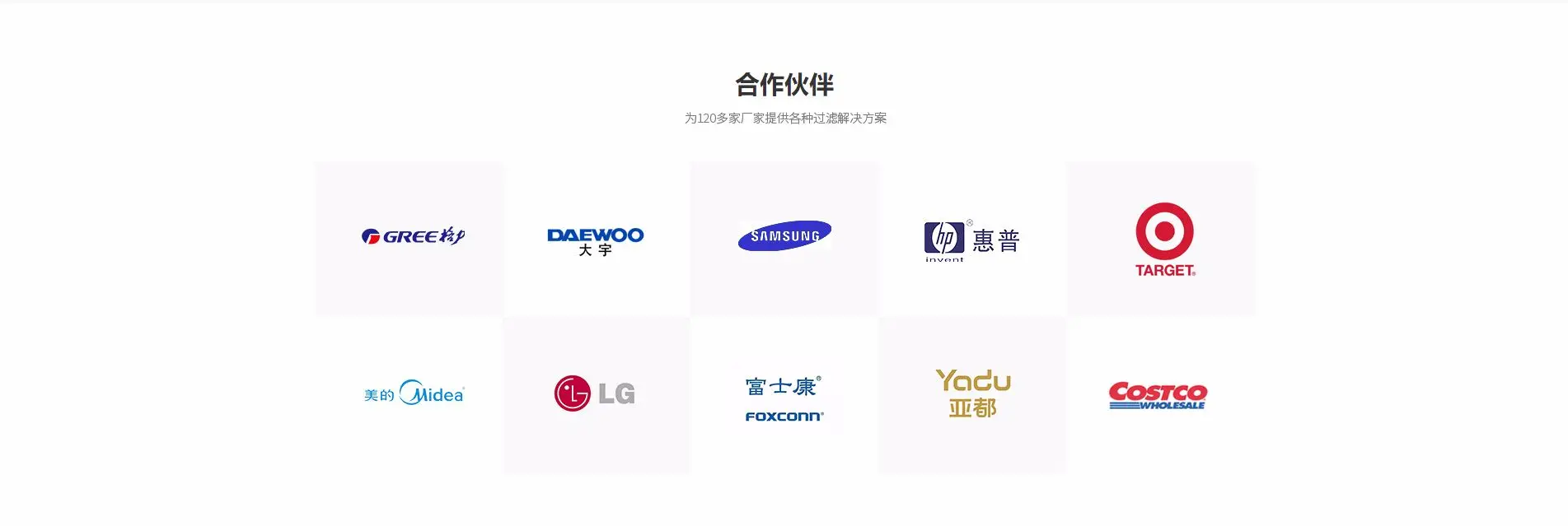 为格力、格兰仕、美的、亚都、富士康、新南风集团、南方电网、HP、LG、Sumsung等120多家厂家提供各种过滤解决方案,定制配套合适的空气滤网!